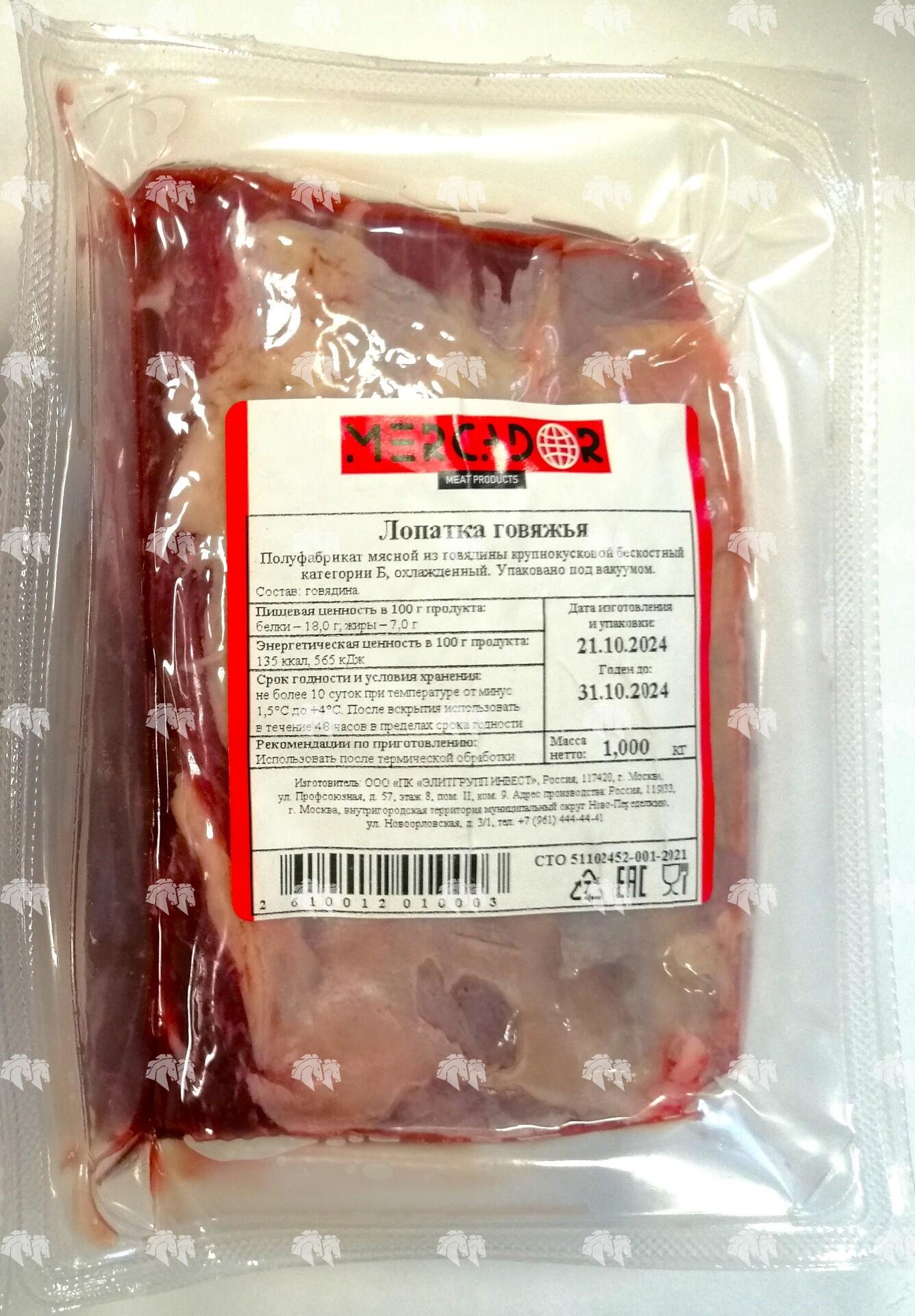 Лопатка. Полуфабрикат мясной из говядины крупнокусковой бескостный категории А. Кусок бескостного мяса от лопаточной части. Фасуется в индивидуальную упаковку (вакуумный термоформер 190х150 мм).
