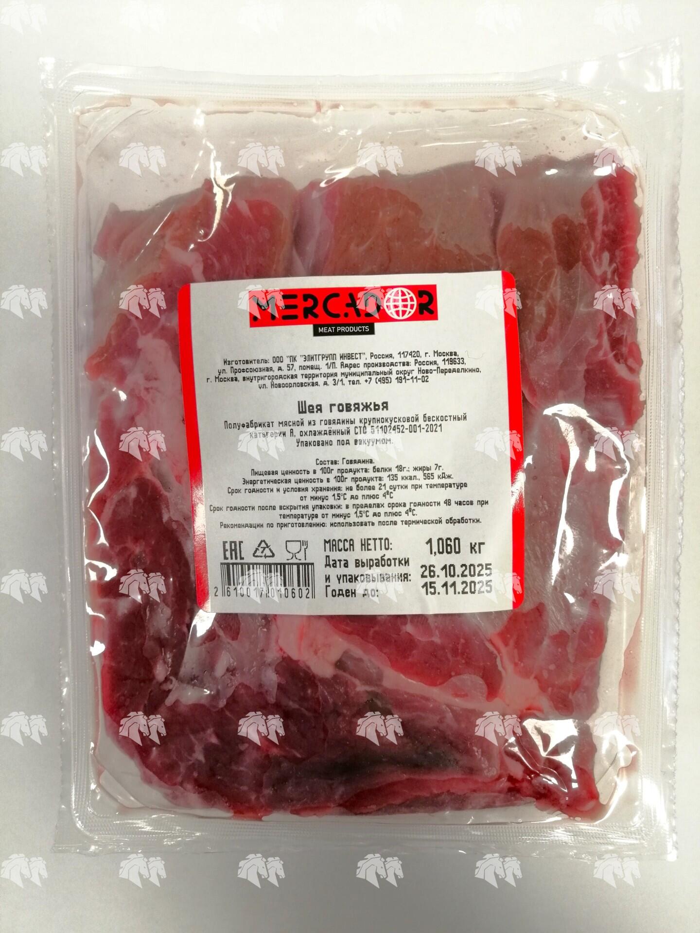 Шея говяжья. Оковалок говяжий. Полуфабрикат мясной из говядины крупнокусковой бескостный категории А. Кусок бескостного мяса от шейной части. Фасуется в индивидуальную упаковку (вакуумный термоформер 190х150 мм).