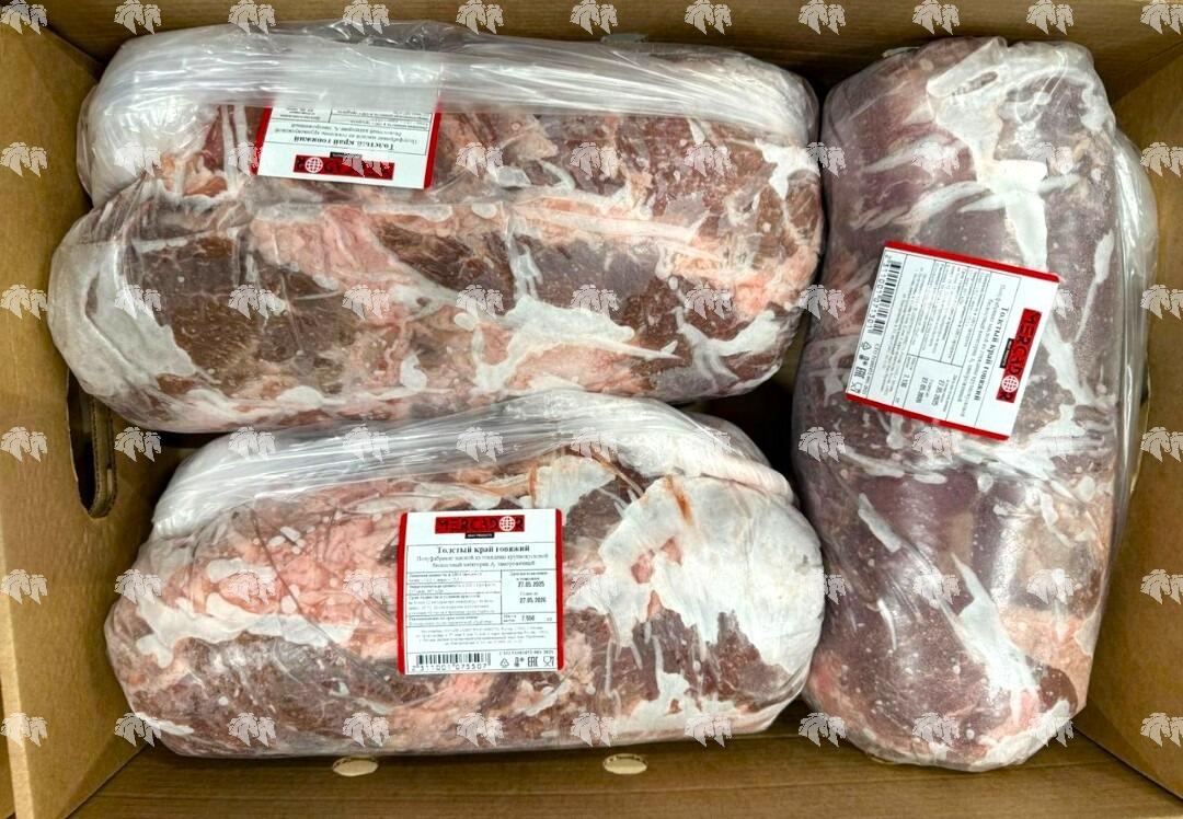 Толстый край говяжий. Полуфабрикат мясной из говядины крупнокусковой бескостный категории А. Мышцы грудного отдела вдоль позвоночника, с естественной поверхностной пленкой, сохраниющей природную форму мышцы.