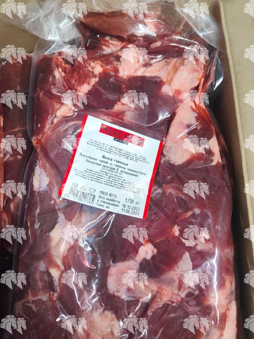 Жилка говяжья. Полуфабрикат мясной из говядины мелкокусковой бескостный категории В. Упаковывается в вакуумный пакет.