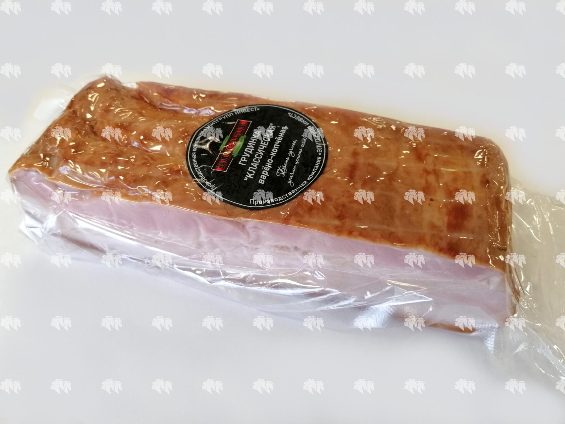 Грудинка «Классическая» копчено-вареная – это изысканный мясной деликатес. Нежная свинина готовится по особой технологии, в результате чего мясо сохраняет мягкость и сочность, приобретает пикантный аромат копчения. Выпускается по ТУ 10.13.14-009-51068146-2020.