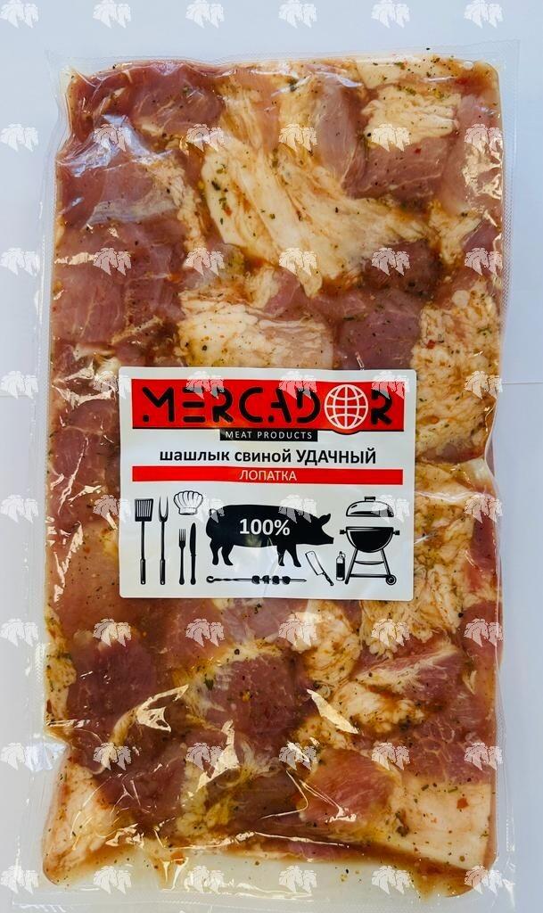Полуфабрикат мясной из свинины мелкокусковой бескостный категории В. Шашлык «УДАЧНЫЙ» изготовлен из свиной лопатки. Ровные аппетитные кусочки лопатки замаринованы традиционным способом с добавлением соли и перца, что придает мясу естественный ароматический вкус. Идеально подходит для жарки на гриле, барбекю, сковороде и запекания в духовке. Фасуется в вакуумный термоформер с фикс весом 1 и 2 кг.